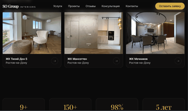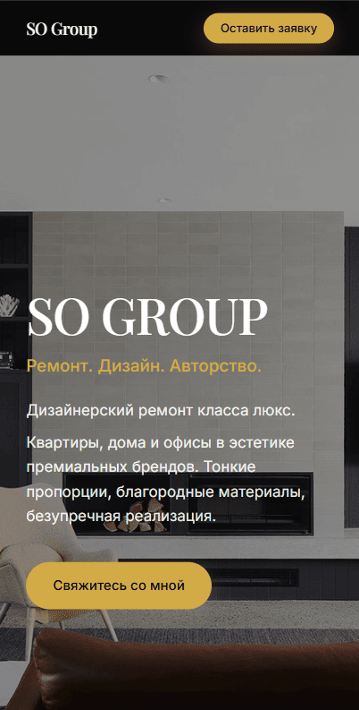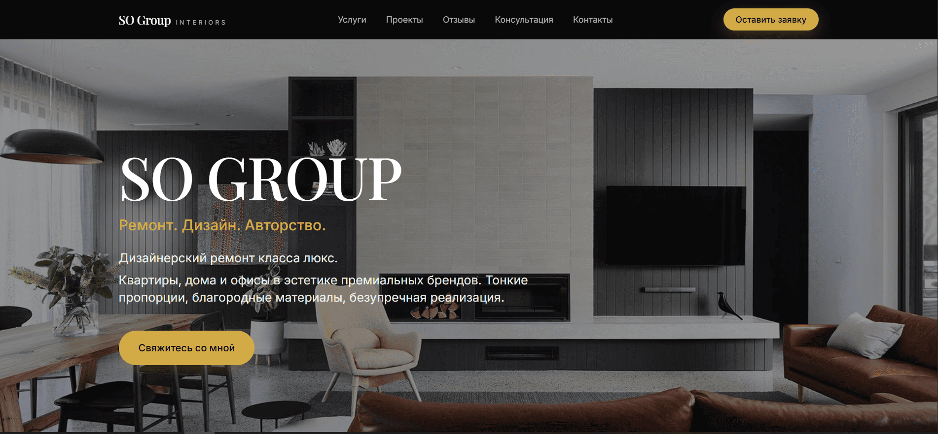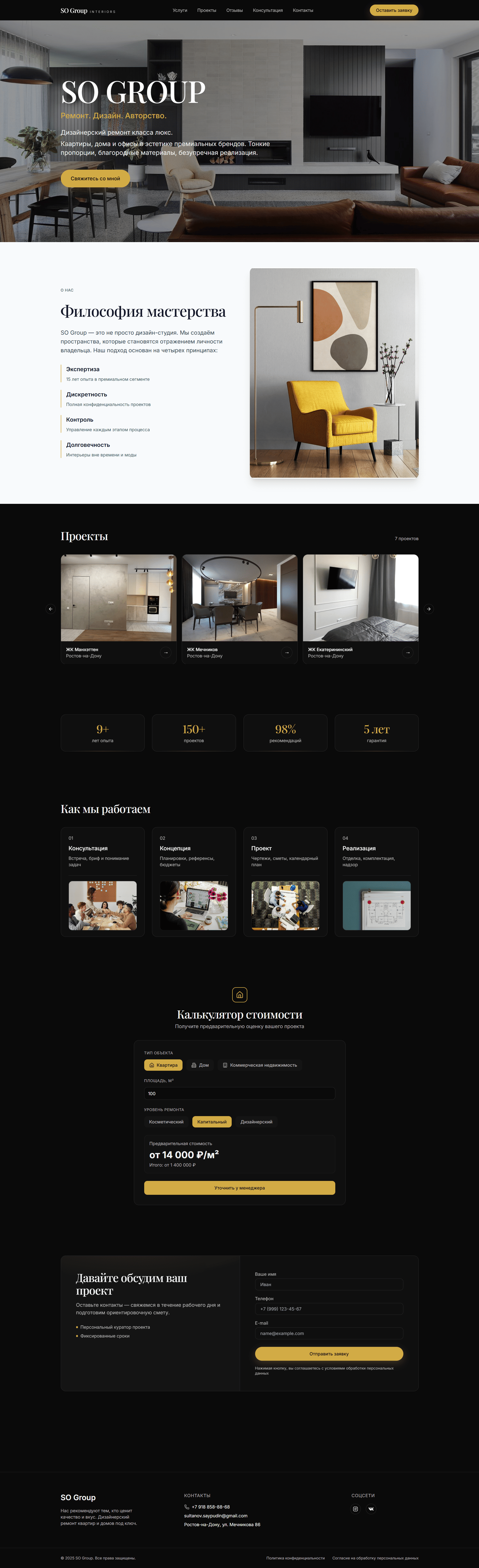 Разработка сайта для SO GROUP: дизайнерский ремонт квартир, домов и офисов класса люкс в эстетике премиальных брендов. Акцент на безупречные пропорции, благородные материалы, авторские дизайн-проекты и высокое качество реализации под ключ в Москве и области