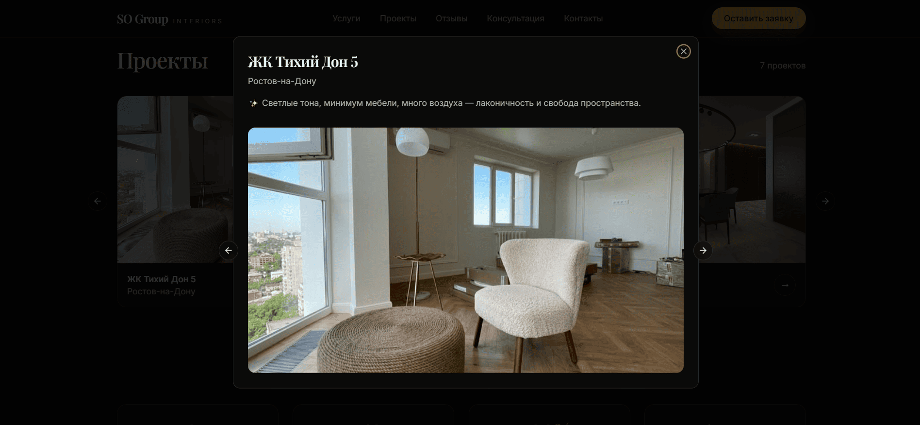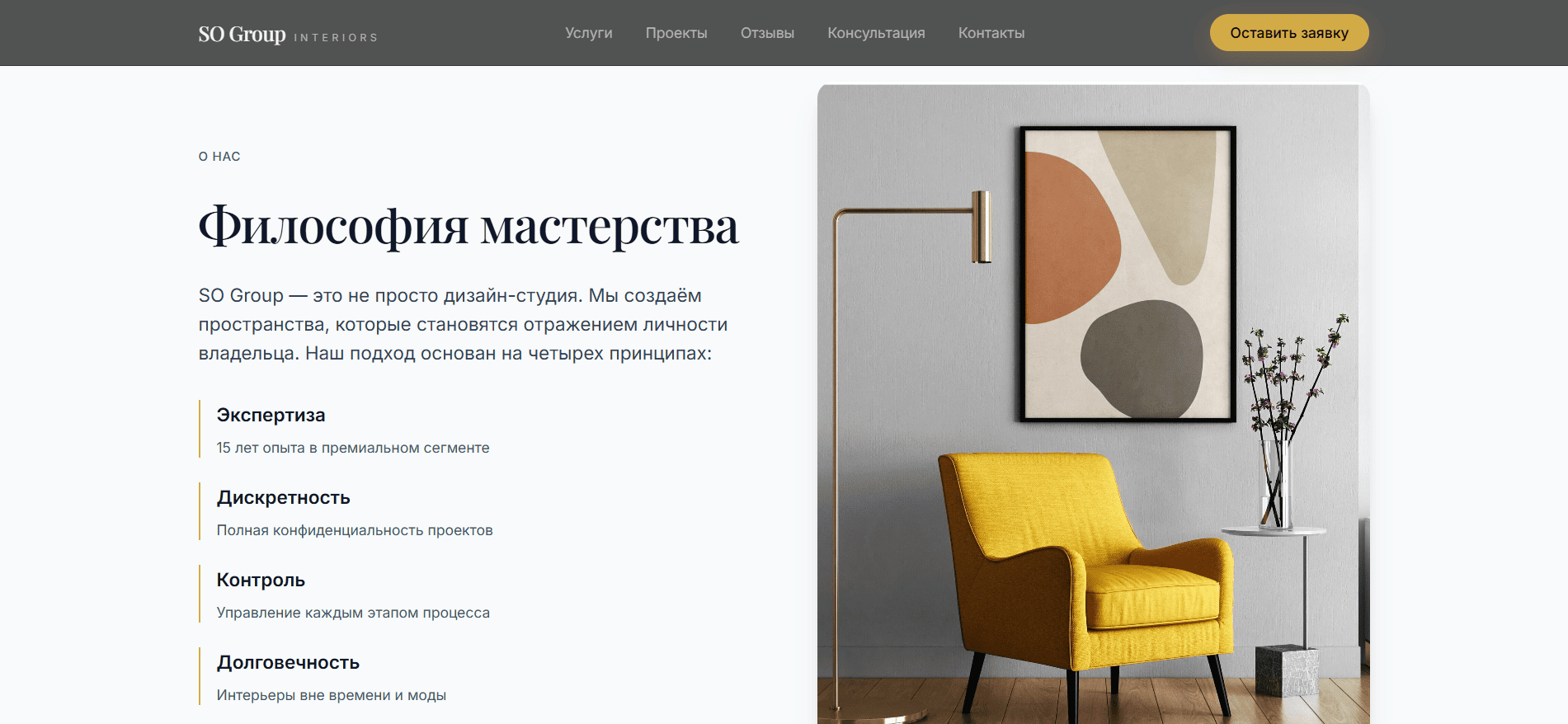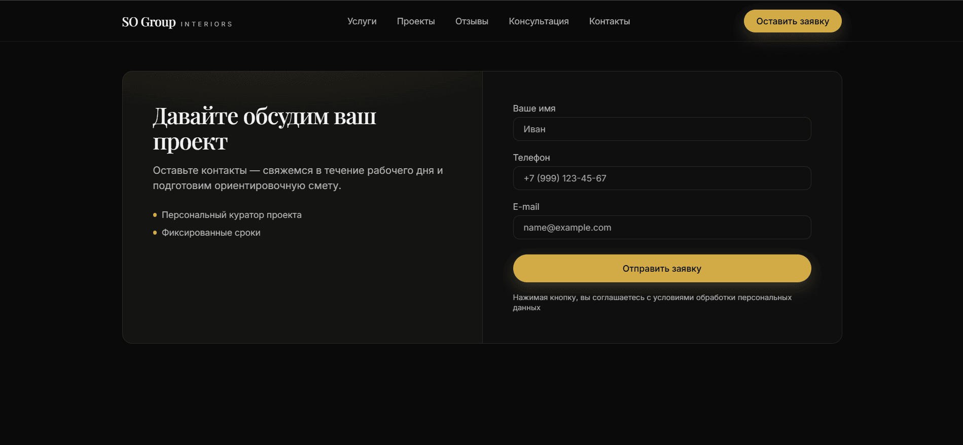 Разработка сайта для SO GROUP: дизайнерский ремонт квартир, домов и офисов класса люкс в эстетике премиальных брендов. Акцент на безупречные пропорции, благородные материалы, авторские дизайн-проекты и высокое качество реализации под ключ в Москве и области