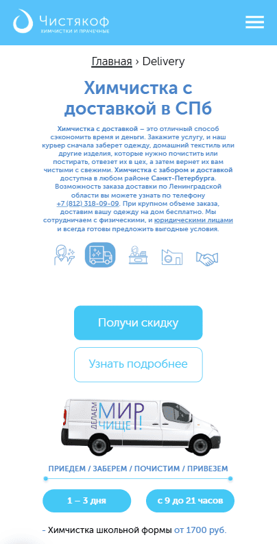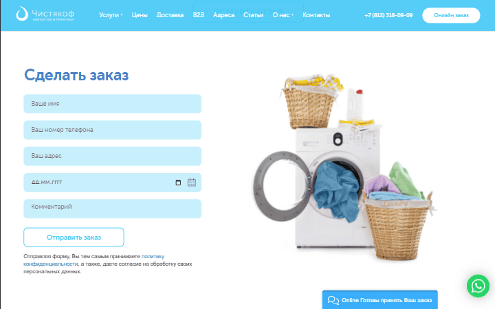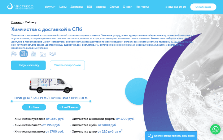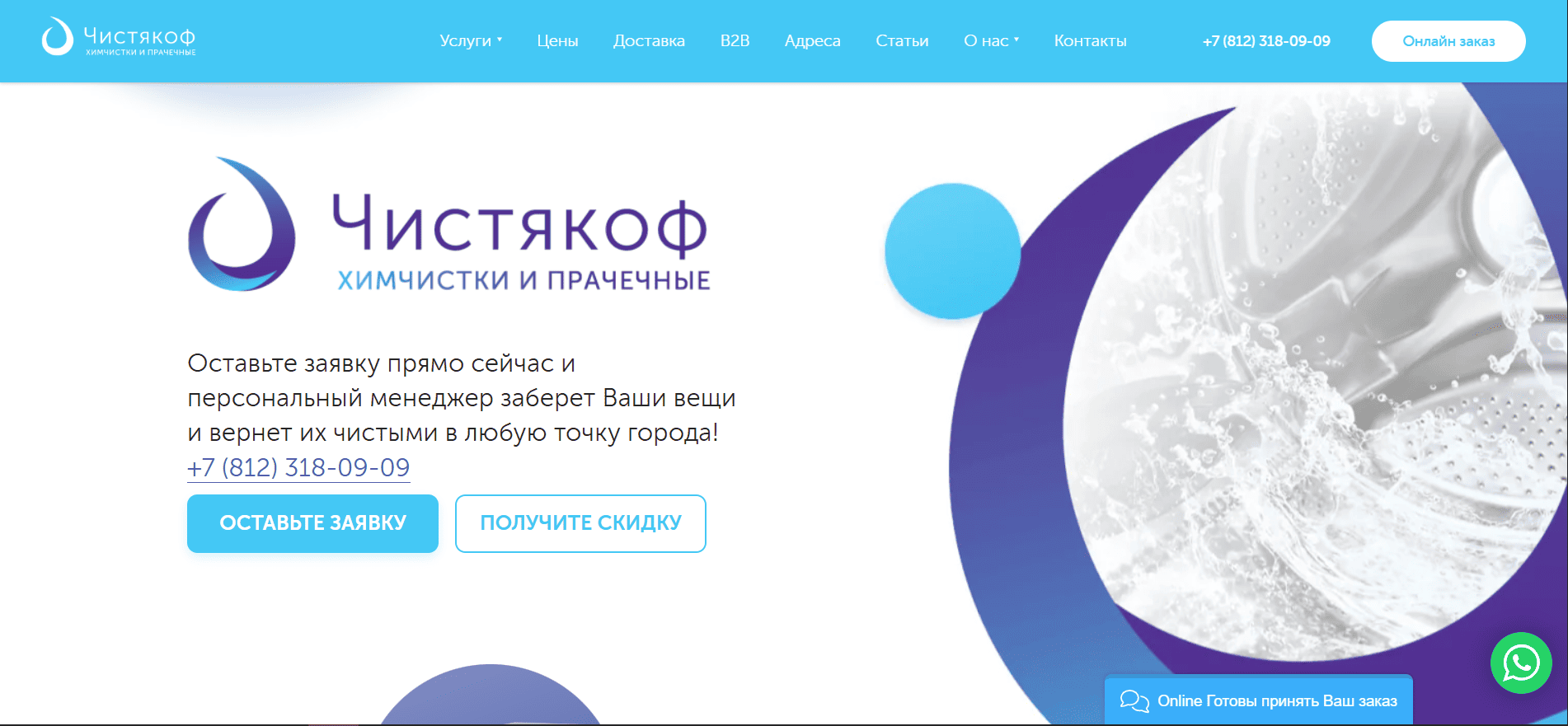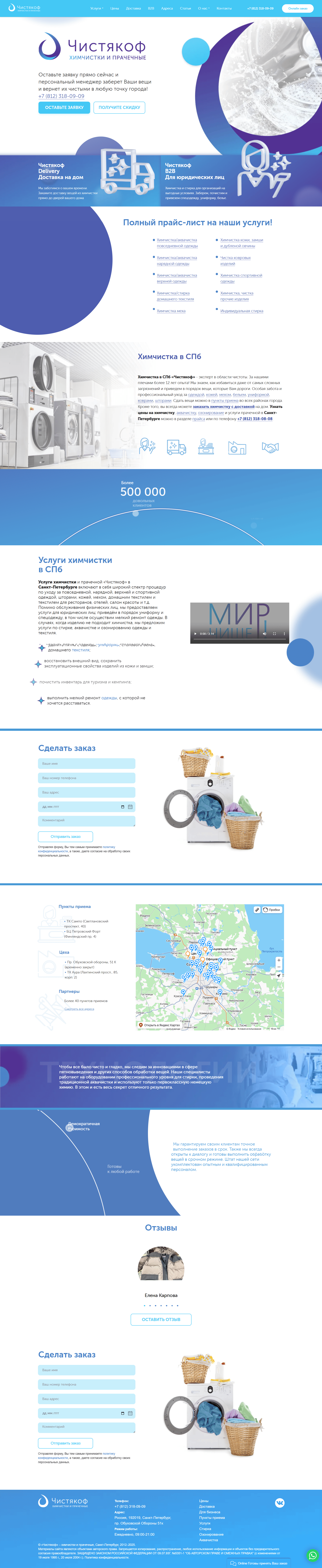 Разработка сайта для компании «Чистякоф»: услуги химчистки и доставки одежды и белья на дом, удобная онлайн-заявка, персональный менеджер для каждого клиента. Также представлен блок B2B для юридических лиц с выгодными условиями обслуживания